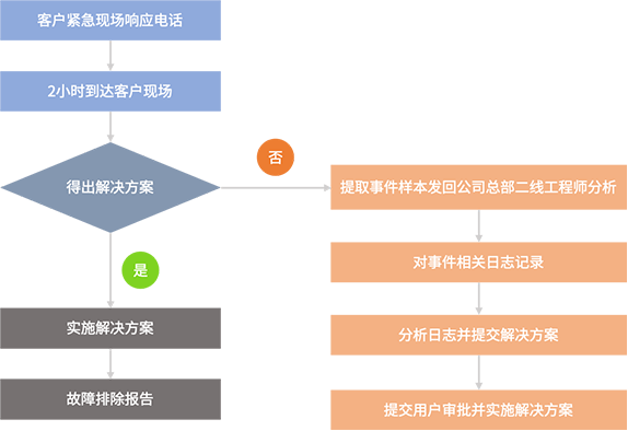 当出现重大系统事故或远程技术服务无法解决的系统问题时,由傲冠负责安排虚拟化资深专家到现场诊断和排除故障,交通正常情况下虚拟化资深专家应在提出服务需求二小时之内到达客户现场。按照客户虚拟化平台实际运行及维护情况,制定切实可行的应急预案。制定虚拟化平台应急演练方案和计划,并可按客户要求依据方案实施系统应急演练。下图为应急响应流程: